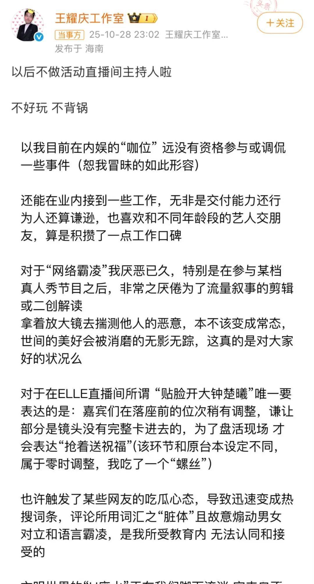 这个“贴得特别近开大”的动作迅速登上热搜,很多网友都在猜,他是不是暗示了前几天钟楚曦在VOGUE抢C位合照的那个小插曲。没过多久,王耀庆工作室就连续发了两条微博,澄清他没有什么内涵,反正当天也只是临时改了个安排,为了搞搞气氛才那么说的。